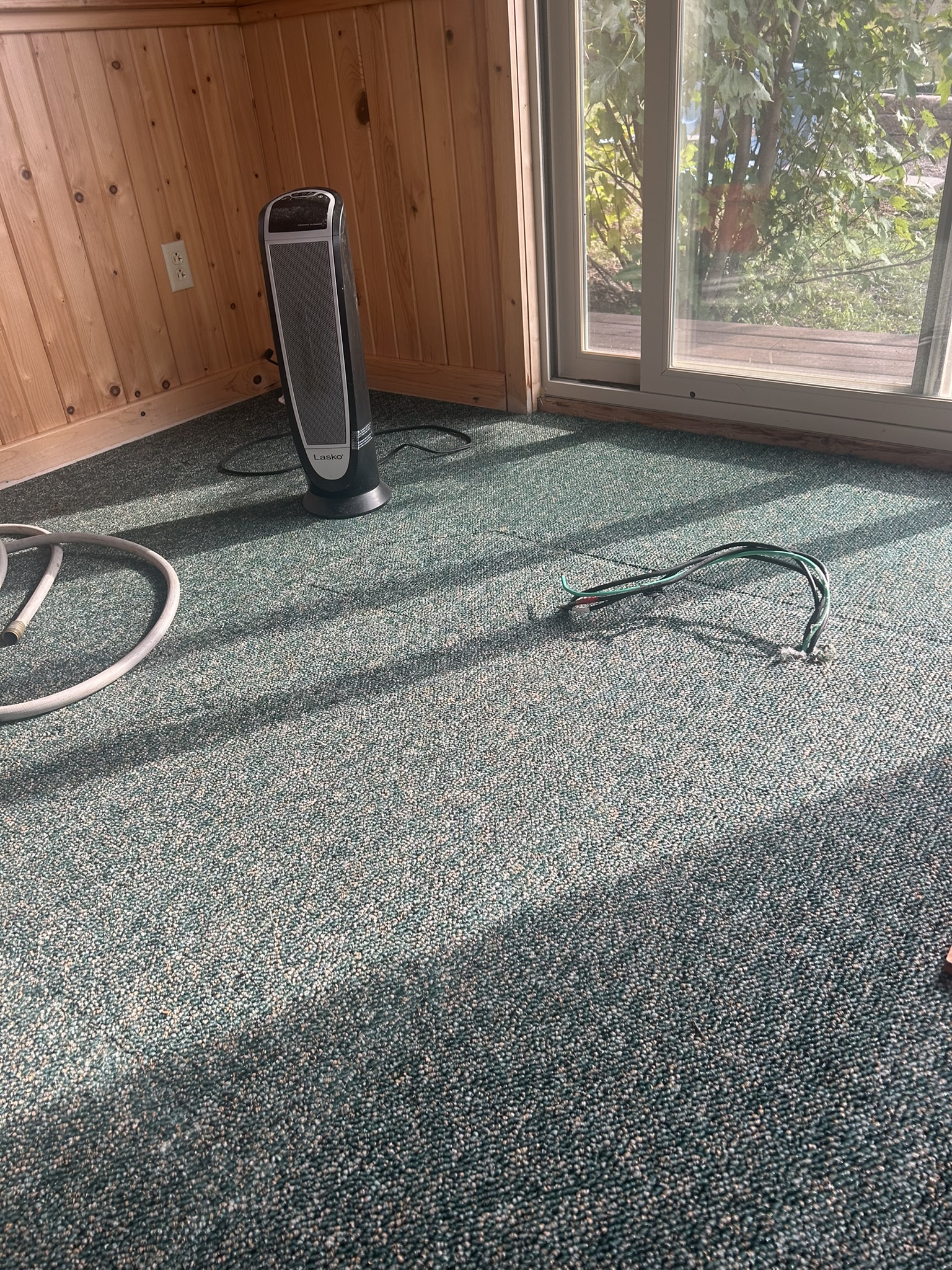 The current flooring is outdoor carpet. It has absorbed years of chlorine from the hot tub. It smells pretty strongly of it. I plan to remove all the carpet and wash down the subflooring to see if that will remove the smell. If need be, I’ll replace the subflooring. I’m going to install hardwood or laminate flooring to make it easy to clean. Being an outbuilding, there is no mud room. I will put a rug over it to make it a bit more comfortable.
