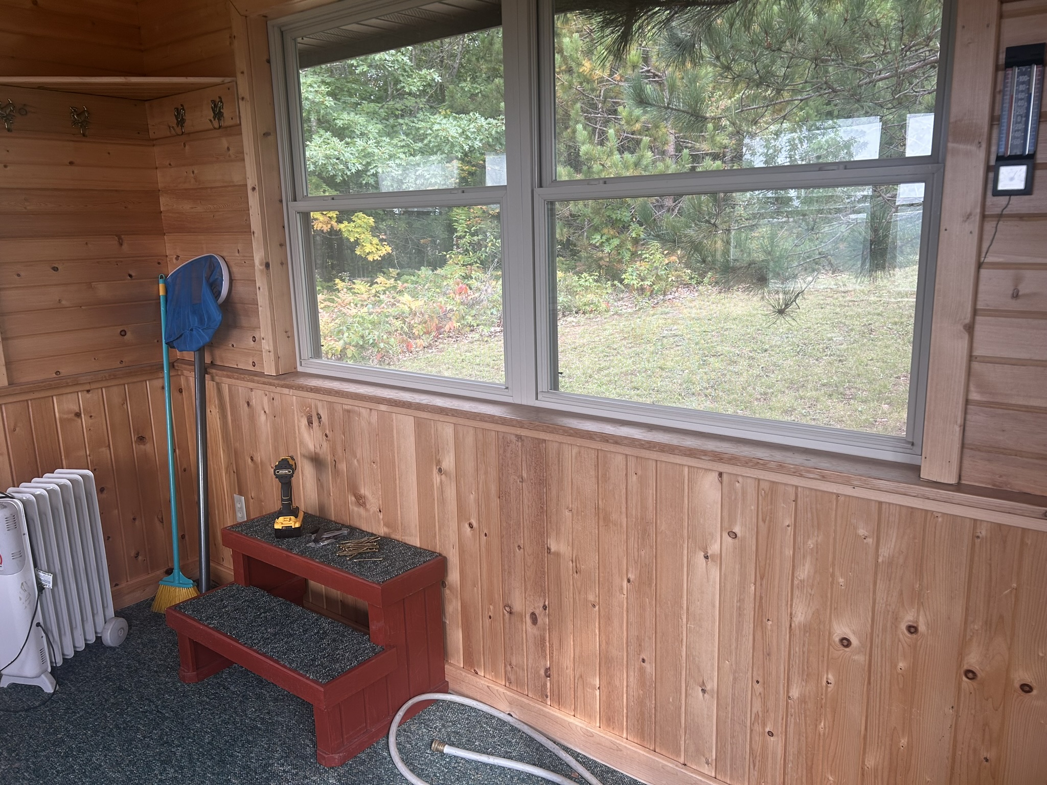 Before we purchased the cabin, this building housed a hot tub but during the purchase process, the hot tub died and we didn’t have it replaced. While a hot tub would be nice, it’s a lot to maintain at a place we aren’t at year round. I didn’t know what to do with the building. It is well constructed, insulated and has regular four-season windows. It certainly can be used as a three season porch but has no climate control or running water. It does have electrical, including 240v for the hot tub.